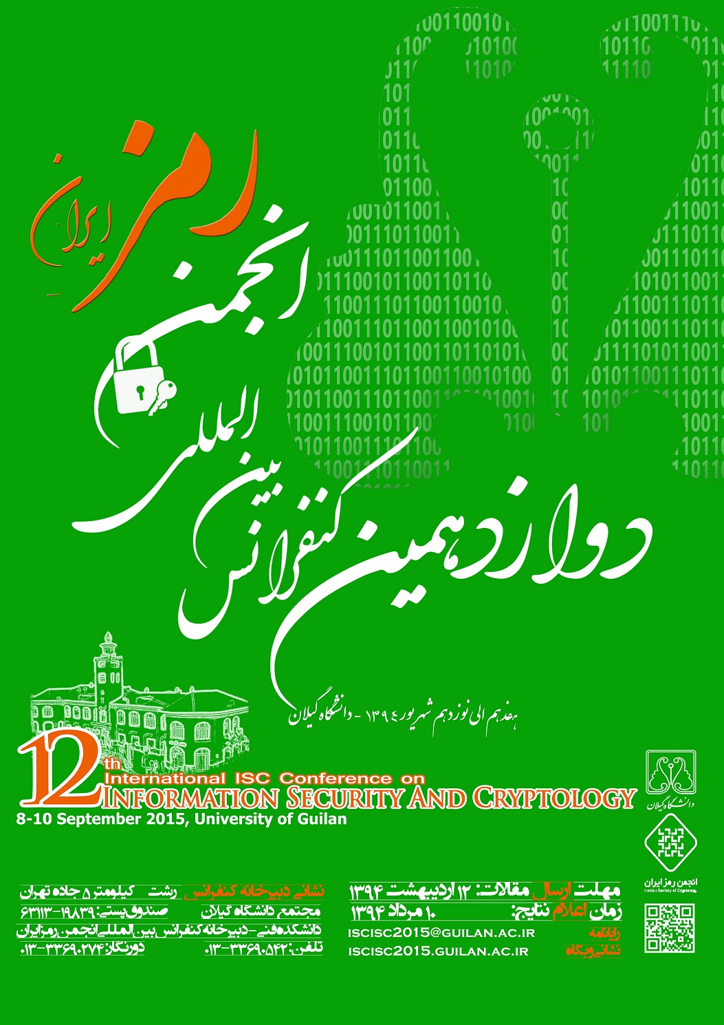 دوازدهمین دوره کنفرانس بينالمللی انجمن رمز ايران در تاریخ 17الی 19 شهریور ماه 1394 در دانشکده فنی دانشگاه گیلان برگزار می شود. دوازدهمین کنفرانس بينالمللی انجمن رمز ايران با هدف همافزايی دانش، و انتشار يافتههای نو و بديع در زمينه امنيت اطلاعات و رمزشناسي، برنامهريزی و اجرا ميشود. آشنايی و ارتباط میان اساتید، پژوهشگران، صاحبنظران، متخصصان، سیاستگذاران و علاقمندان حوزه امنيت فضای تبادل اطلاعات، بررسی چالشهای علمی و اجرايی در فرآيند کاربری آن در فضای مجازی و تاکيد بر امنسازی فضای تبادل اطلاعات در کشور از ديگر اهداف برگزارکنندگان میباشد. کميته علمی این کنفرانس از تمامی اساتید و پژوهشگران دعوت مینماید مقالات خود را که حاوی آخرین یافتههای علمی در یکی از زمینههای ذیل و یا سایر زمینههای مرتبط است به دبیرخانه کنفرانس ارسال نمایند. • مبانی رمزشناسی •▫ مبانی نظری رمزنگاری •▫ طراحی و تحلیل الگوریتم های رمزنگاری جریانی و قالبی متقارن •▫ طراحی و تحلیل الگوریتم های رمز نامتقارن و طرح های امضای رقمی •▫ طراحی و تحلیل توابع چکیده ساز •▫ روشهای نوین در رمزنگاری (نظیر پسا کوانتومی، رمزگذاری تابعی، رمزنگاری همریخت، ...) • پیادهسازی الگوریتمهای رمزنگاری و حملات مرتبط •▫ پیاده سازی نرمافزاری و سختافزاری الگوریتمهای رمزنگاری •▫ حملات کانال جانبی و روشهای مقابله با آن •▫ سامانههای نهفته رمزنگاری •▫ دستکاری سختافزار و روشهای مقابله با آن •▫ شتاب دهندههای سختافزاری برای پروتکلهای امنيتی •▫ درستی سنجی و عیبیابی پیاده سازیها • امنیت شبکه •▫ امنیت شبکه های بی سیم و موبایل •▫ امنيت زير ساخت های شبکه •▫ امنیت پروتکل ها و لایه های شبکه •▫ سیستم های تشخیص، ردیابی و جلوگیری از نفوذ •▫ امنیت زیرساختهای حیاتی • پروتکلهای امنیتی •▫ احراز هویت و اصالت •▫ گمنامی، حریم خصوصی و مدیریت اعتماد •▫ تحلیل پروتکلهای امنیتی •▫ مدلهای امنيت و اعتماد •▫ روشهای صوری در امنیت اطلاعات • امنیت رایانش •▫ امنیت معماری رایانه •▫ امنیت سیستم عامل •▫ امنیت پایگاه داده •▫ تحلیل آسیب پذیری و امنیت نرمافزار و برنامه های کاربردی •▫ امنيت و حريم خصوصی در افزاره های همراه •▫ امنیت رایانش ابری •▫ کنترل دسترسی • مهندسی امنیت و امنیت خدمات الکترونیکی •▫ روشهای مهندسی اجتماعی در امنیت •▫ سامانه مدیریت امنیت اطلاعات (ISMS) •▫ آموزش امنیت •▫ امنیت کسب و کار و خدمات الکترونیکی •▫ امنيت سلامت الکترونیکی •▫ امنیت بانکداری الکترونیکی •▫ امنيت آموزش الکترونيکی • نهان سازی اطلاعات •▫ الگوریتم های جدید در نهان نگاری و نشان گذاری •▫ مدل سازی حملات و کانال نشان گذاری •▫ نهان کاوی اطلاعات •▫ کاربردهای نهان سازی اطلاعات •§ جرمیابی در فضای مجازی •▫ روشهای جرم یابی و ريشه يابی ديجيتال •▫ جرم یابی پایگاه داده و شبکه •▫ تشخیص کلاه برداری •▫ تشخیص و جلوگیری از دستکاری •▫ تحليل بدافزار و ضد بدافزار نشانی دبیرخانه کنفرانس: آدرس: رشت -کیلومتر 5 جاده تهران- مجتمع دانشگاه گیلان - دانشکده فنی- دبیرخانه کنفرانس بینالمللی انجمن رمز ایران، صندوق پستی: 63113-19839 ، تلفن: 33690542 - 013، دورنگار: 33690274 - 013 رایانامه: iscisc2015@guilan.ac.ir، isc2015@isc.org.ir نشانی وبگاه: http://iscisc2015.guilan.ac.ir